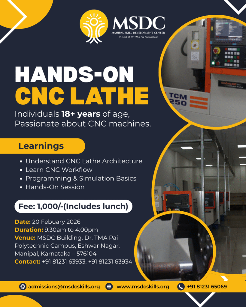 MSDC (Manipal Skill Development Center) invites you to a one-day Hands-On CNC Lathe Workshop designed for individuals aged 18+ who are passionate about manufacturing and CNC technology. This practical training program provides in-depth exposure to CNC lathe machines, their architecture, workflow, and basic programming techniques.