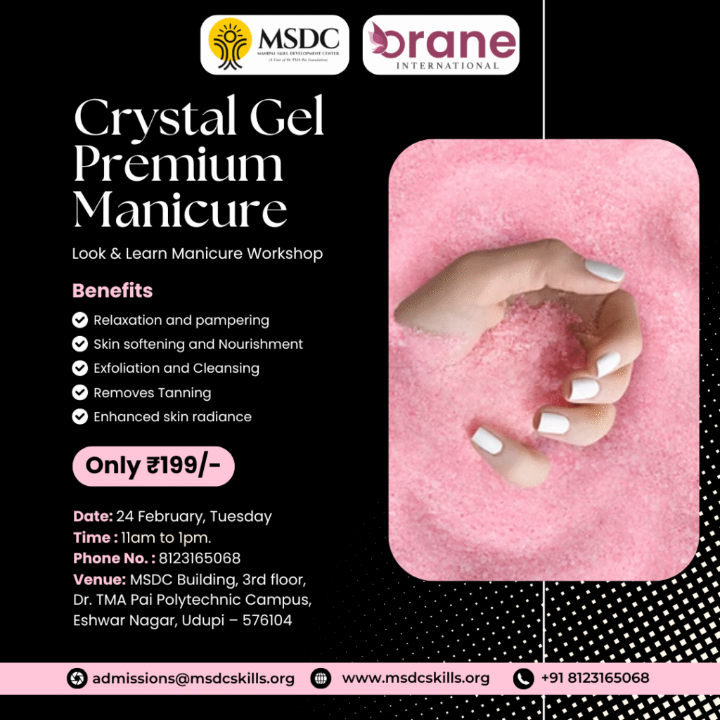 Manipal Skill Development Center (MSDC), in association with Orane International, is organizing an exclusive “Crystal Gel Premium Manicure – Look & Learn Workshop” on 24th February (Tuesday) from 11:00 AM to 1:00 PM at the MSDC Building, 3rd Floor, Dr. TMA Pai Polytechnic Campus, Eshwar Nagar, Udupi.