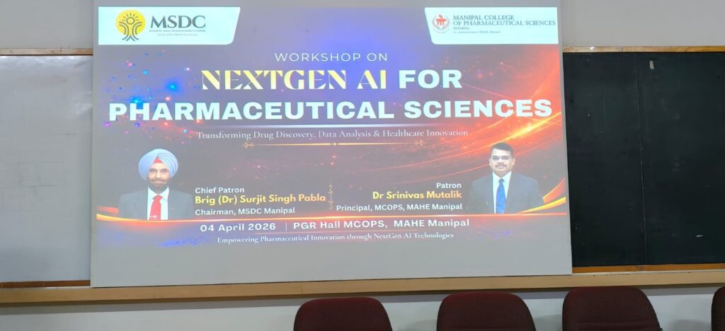 The Manipal Skill Development Center (MSDC), Manipal, in association with the School of IT Skills and Manipal College of Pharmaceutical Sciences (MCOPS), MAHE, successfully conducted a workshop on “NextGen AI for Pharmaceutical Sciences” on 04 April 2026 at MCOPS, MAHE, Manipal.